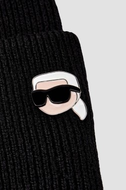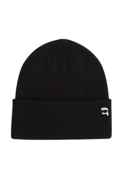 The black Karl Lagerfeld men's cap from the Ikon collection is the perfect combination of style and functionality. Made of soft, warm knit fabric with a touch of wool, decorated with a metal pin with the designer's image. The classic cut makes it a perfect complement to any winter styling.
