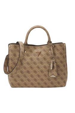 Brown logoed Meridian women's handbag, by Guess, made of eco-friendly leather. It has three compartments, two closed with a magnet one zippered, inside three pockets: two slip-in, one zippered. The bag has an adjustable strap, protective feet, and comes with a dust bag.