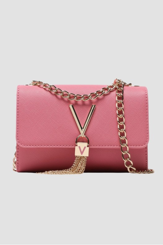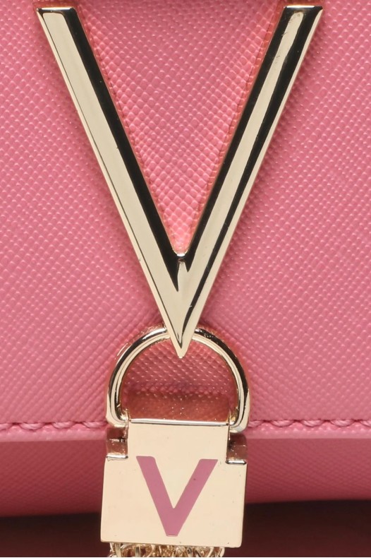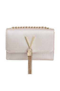 Platinum Divina SA small evening handbag with glossy texture and decorative metal "V", by Valentino by Mario Valentino. The flap closes with a snap closure, inside one zipped pocket and one slip pocket. Dust bag included.