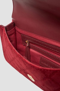 Red women's Life Pochette handbag by Valentino By Mario Valentino. Made of velour polyester, it closes with a magnet. It has one compartment, one pocket and a non-adjustable strap. Comes with a dust bag.