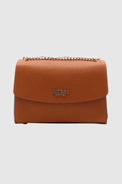 Brown Calista women's handbag by Guess, made of eco-friendly leather. It has a non-adjustable strap, one large compartment with three slip pockets and one zippered pocket, and an additional exterior compartment with a magnet closure. Equipped with protective feet and a dust bag.