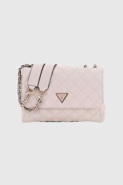 Beige women's handbag by Guess, made of eco-friendly leather. It has two compartments closed with a magnet flap - one with a zipper pocket, the other with six card pockets. An additional zippered pocket on the back. Comes with a dust bag.