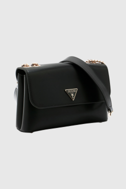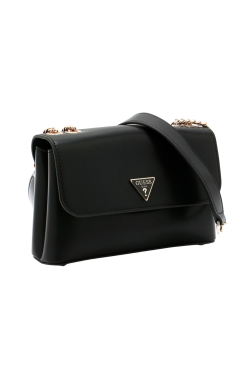Black women's handbag by Guess, made of eco-friendly leather. It has a non-adjustable strap, one large compartment with three slip pockets and one zippered pocket, and an additional exterior compartment with a magnet closure. Equipped with protective feet and a dust bag.