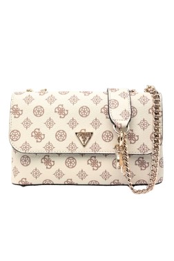 Beige women's handbag by Guess, made of eco-friendly leather. It has a non-adjustable strap, one large compartment with three slip pockets and one zippered pocket, and an additional exterior compartment with a magnet closure. Equipped with protective feet and a dust bag.