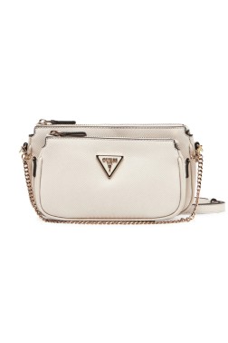 Beige Noelle women's handbag by Guess, made of eco-friendly leather. It has an adjustable strap, one large compartment with three slip pockets for cards and one zippered pocket, and an external zippered pocket. It comes with a detachable pouch measuring 11 × 19.5 × 3 cm, which can be used as a small handbag.