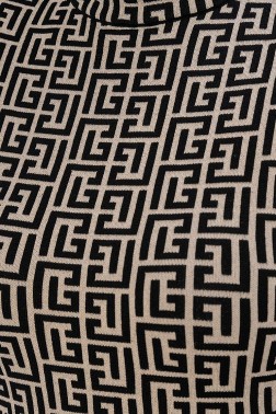 Ivory-colored knit blouse with black Balmain monogram. With a stand-up collar and shoulder pads. Long sleeves and hem finished with black ribbing.