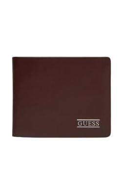 Brown men's natural leather wallet by Guess. It features a snap-lock coin pocket, eight card slots, two slip pockets and two compartments.