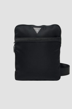 Black men's Milano pouch by Guess, made of durable eco-friendly leather. It features an adjustable strap, one roomy main compartment, two exterior zippered pockets and two interior slip pockets. Its modern design and practical solutions make it a great choice for everyday use.