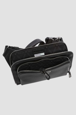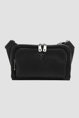 Black men's Milano pouch by Guess, made of eco-friendly leather. It features one large compartment, two exterior zippered pockets and two slip pockets inside. An adjustable strap ensures comfortable carrying. Perfect for everyday use - it combines simplicity with functionality.