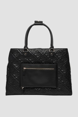 Black women's travel handbag, has three capacious zippered compartments: one compartment inside has three slip pockets, the second compartment has one slip pocket, the third compartment has one zippered pocket. The outside of the bag has protective feet, two zippered pockets and one zippered pocket.