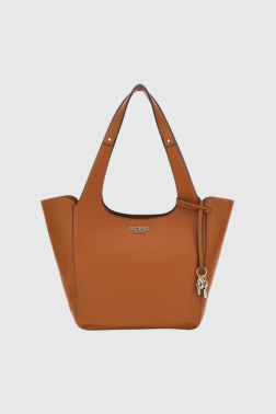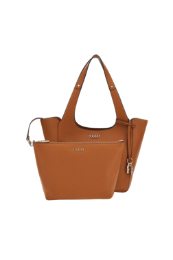Brown Calista women's handbag by Guess, made of eco-friendly leather. It has one large compartment fastened with a magnet with a slip pocket. It comes with a small sachet that can be used as a separate handbag. Dimensions of the pouch: 31 × 20 × 8 cm.