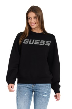 The black women's Cecilia zirconia sweatshirt from Guess is an elegant and stylish choice for any woman. Made of high-quality materials, including 77% viscose, 15% polyamide and 8% elastane, it ensures comfortable wear and a perfect fit. The hoodless model, tucked in over the head, in Regular Fit cut, features a round neckline and long sleeves. An additional advantage is the zirconia embellishments, which give the blouse a unique charm.
