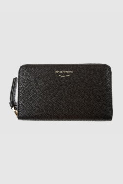 EMPORIO ARMANI women's medium sized wallet in black. On the front, the company's logo in gold. Zippered wallet. 6 card slots and 2 bill compartments. Zippered coin pocket.