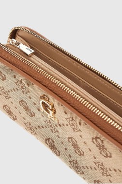 Beige women's fabric wallet by Guess. Zippered, it features a coin pocket, two compartments, 12 card slots, two slip pockets and an additional exterior zippered pocket.