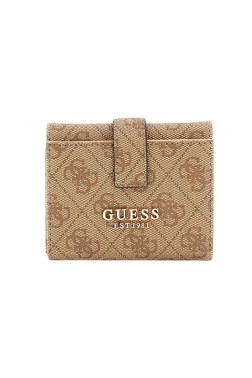 Beige women's ecological leather wallet by Guess. It closes with a snap closure, inside there is a zippered coin pocket, six card slots and a slip pocket for banknotes.