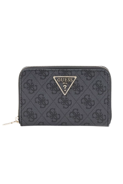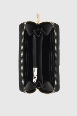 Black women's wallet by Guess, made of eco-friendly leather. Zippered, it features an internal coin pocket, two compartments, four card slots and two slip pockets.