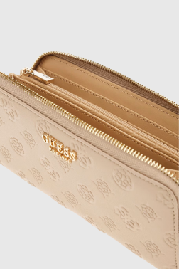 Beige women's ecological leather wallet by Guess. Zippered, inside zippered coin pocket, two compartments, 12 card slots, two slip pockets and an additional zippered pocket on the back.