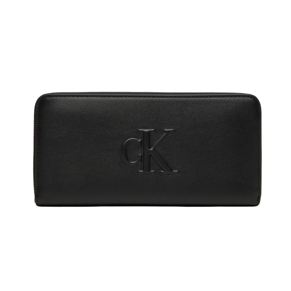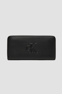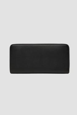 Czarny damski portfel marki Calvin Klein, wykonany ze skóry ekologicznej. Zamykany na zamek, posiada zasuwaną kieszeń na bilon, dwie przegrody, osiem miejsc na karty oraz cztery wsuwane kieszenie.
