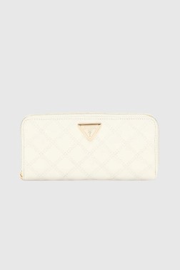 Biały damski portfel ze skóry ekologicznej marki Guess. Zamykany na zamek, wewnątrz zasuwana kieszeń na bilon, 2 przegrody, 12 miejsc na karty, 2 wsuwane kieszenie i zamykana na zamek kieszeń z tyłu portfela.