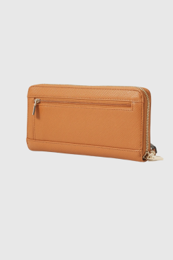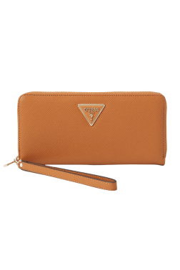 Brązowy damski portfel ze skóry ekologicznej marki Guess. Zamykany na zamek, wewnątrz zasuwana kieszeń na bilon, dwie przegrody, 12 miejsc na karty, dwie wsuwane kieszenie i dodatkowa kieszeń na zamek z tyłu.
