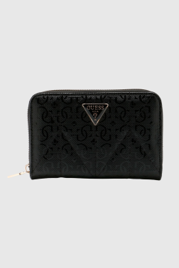 Czarny portfel damski marki Guess, wykonany ze skóry ekologicznej. Zamykany na zamek, posiada wewnętrzną kieszeń na bilon, dwie przegrody, cztery miejsca na karty i dwie kieszenie wsuwane.