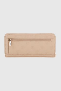 Beżowy damski portfel ze skóry ekologicznej marki Guess. Zamykany na zamek, wewnątrz zasuwana kieszeń na bilon, dwie przegrody, 12 miejsc na karty, dwie wsuwane kieszenie i dodatkowa kieszeń na zamek z tyłu.
