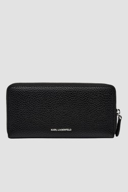 Czarny damski portfel ze skóry ekologicznej marki Karl Lagerfeld. Zamykany na zamek, wewnątrz zasuwana kieszeń na bilon, 2 przegrody, 8 miejsc na karty i 2 wsuwane kieszenie.
