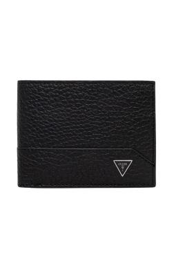 Czarny męski portfel ze skóry naturalnej marki Guess. Posiada zamykaną na zatrzaska kieszeń na bilon, osiem miejsc na karty, dwie wsuwane kieszenie i dwie przegrody.