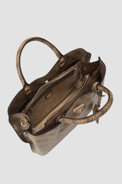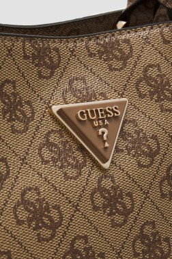Brązowa logowana torebka damska Meridian, marki Guess, wykonana ze skóry ekologicznej. Posiada trzy komory, dwie zamykane na magnes jedną zasuwaną na zamek, w środku trzy kieszenie: dwie wsuwane, jedna zasuwana. Torebka posiada regulowany pasek, nóżki ochronne, w zestawie worek przeciwkurzowy.