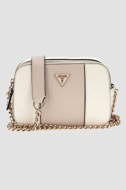 Biało-beżowa torebka damska Noelle II marki Guess, wykonana ze skóry ekologicznej. Posiada dwie komory zamykane na zamek, wewnętrzną kieszeń na suwak oraz miejsce na karty. Wyposażona w nóżki ochronne, nieregulowany pasek i worek przeciwkurzowy.