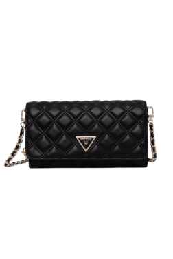 Czarna torebka damska marki Guess, wykonana ze skóry ekologicznej. Zamykana na klapkę z magnesem, posiada trzy komory wewnętrzne, środkowa zamykana na zamek. Posiada aż dziewięć miejsc na karty, w tym jedno z okienkiem. Z tyłu dodatkowa kieszeń zamykana na suwak. Możliwość regulowania długości paska.