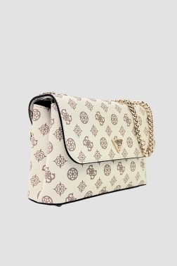 Beżowa torebka damska marki Guess, wykonana ze skóry ekologicznej. Posiada pasek bez regulacji długości, jedną dużą komorę z trzema kieszeniami wsuwanymi i jedną zasuwaną na zamek oraz dodatkową komorę zewnętrzną zamykaną na magnes. Wyposażona w nóżki ochronne i worek przeciwkurzowy.