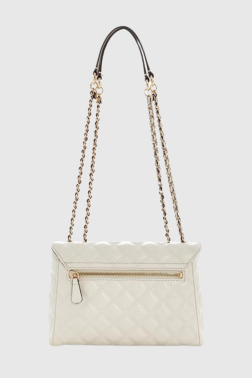 Biała torebka damska marki Guess, wykonana ze skóry ekologicznej. Posiada dwie komory zamykane klapką na magnes – jedna z kieszenią na suwak, druga z sześcioma kieszeniami na karty. Z tyłu dodatkowa kieszeń zamykana na zamek. W zestawie worek przeciwkurzowy.