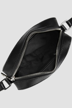 Mała czarna torebka o teksturze skóry z ozdobnym "V". Komora zasuwana na zamek. W środku jedna kieszeń na suwak i przegródka.