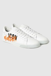 Adidași bărbătești în alb cu logo neon. Confecționați din piele naturală de vițel. Talpă din cauciuc alb.