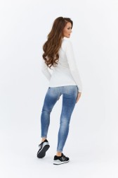 Blugi GUESS pentru femei, de culoare albastră, cu frecare. Potriviți, cu talie înaltă, picioare înguste. Fermoar cu fermoar și închidere cu buton. Trei buzunare față, două buzunare spate. Buzunar dreapta spate cu logo triunghiular aplicat.