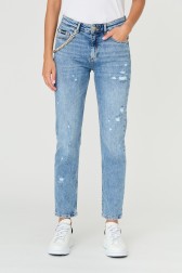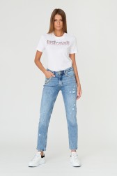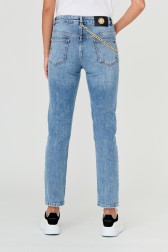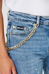 Blugi albaștri pentru femei de la Just Cavalli, cu margini frecate și un detaliu decorativ cu lanț auriu.