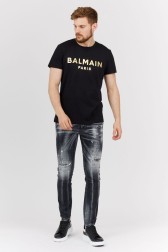 Blugi bărbătești negri cu închidere cu nasturi. Decorat cu frecare și pete. Trei buzunare în față, două buzunare slip în spate. Etichetă logo roșie la închiderea din față. Etichetă logo neagră pe spate.