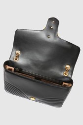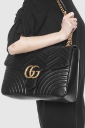 Geanta mare GG Marmont de la GUCCI este fabricată din piele naturală de înaltă calitate, cu un model neobișnuit în formă de heringbone. Partea din spate a genții prezintă o inimă subtilă în relief care adaugă o notă romantică. Geanta de mână este extrem de funcțională datorită închiderii robuste prin clic care asigură o închidere sigură. Interiorul are un buzunar cu fermoar și două buzunare glisante. Lanțul din aur antic poate fi purtat pe umăr (55 cm) sau folosit ca mâner (30 cm).