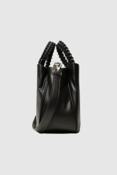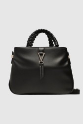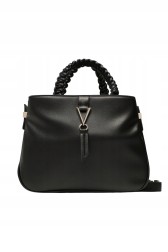 Geantă de mână neagră cu mânere împletite. Are trei compartimente, două închise cu un magnet, unul cu fermoar.