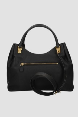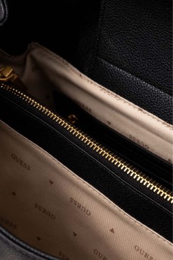 Geantă de mână neagră 'Cosette Girlfriend Carryall' de la Guess. Geanta se închide cu un magnet și este fabricată din piele ecologică de înaltă calitate. Are o curea reglabilă și mânere cu o înălțime de 16 cm. În interior există trei compartimente: două glisante, unul cu fermoar. Un buzunar suplimentar cu fermoar pe exterior. Fundul genții este protejat de piciorușe. Sac de praf inclus.