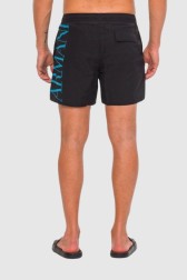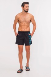 Pantaloni scurți de baie pentru bărbați EMPORIO ARMANI de culoare neagră. Logo mare în turcoaz pe piciorul stâng. Două buzunare pe laterale și unul pe spate cu închidere cu velcro. Talie elastică cu șnururi terminate cu capete metalice cu logo.