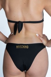 Fund de bikini Moschino în negru. Model din țesătură netedă. Logo metalic auriu pe lateral. Marca imprimată în tonuri aurii la spate.