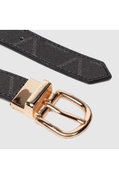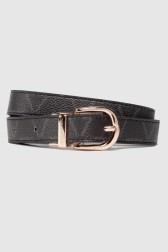 Curea pentru femei cu două fețe și cataramă pivotantă aurie. O parte neagră cu logo. Cealaltă parte în negru.
