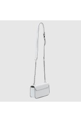 Geantă mică albă imitând pielea de crocodil pe o curea reglabilă. Închidere cu clapă cu doi magneți. Trei buzunare interioare.