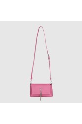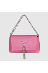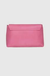Geantă de mână cu textură de piele roz, cu un "V" decorativ argintiu. Clapetă cu închidere cu magnet, compartiment cu fermoar. În interior un buzunar cu fermoar și două buzunare slip.