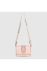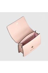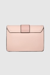 Geantă de mână roz cu o inimă metalică aur pal și o curea de culoare deschisă. Închisă cu un magnet. În interior un buzunar cu fermoar și un compartiment.