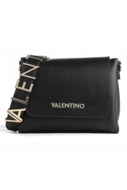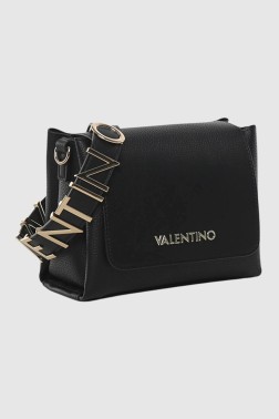 Geantă de mână Alexia Satchel în negru de la Valentino by Mario Valentino. Clapetă închisă cu un magnet. Trei compartimente, cel central cu închidere cu fermoar. Un buzunar cu fermoar în interior. Include curea ajustabilă atașabilă, curea cu logo atașabilă de 78 cm și sac de praf.