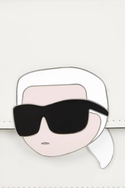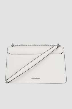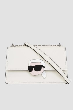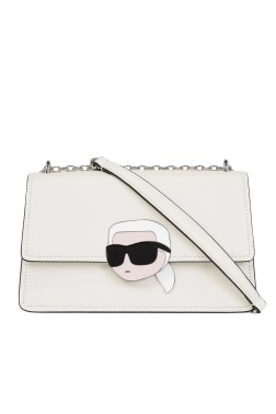 Geantă albă K/iconic 2.0 din piele de la Karl Lagerfeld. Geanta este fabricată din piele naturală și are o curea lungă de 112 cm. Înălțimea mânerelor este de 25,5 cm. Clapeta se închide cu un buton de presă, în interior există două buzunare glisante. Buzunar suplimentar pe exterior.
