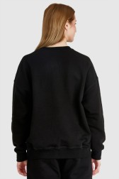 Hanorac de damă în negru. Logo alb pe față. Partea de jos și mânecile sunt finisate cu tiv canelat.